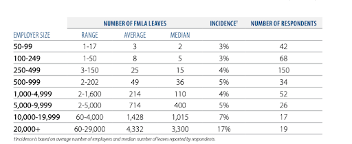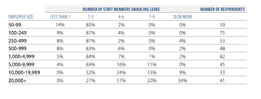 But with the growing size of the organization, “keeping the spirit” gets increasingly complicated. According to the Disability Management Employer Coalition survey, the number of healthcare-related (FMLA) leaves vastly increased with the number of employees. And so rises the number of employees fully dedicated to managing leaves.