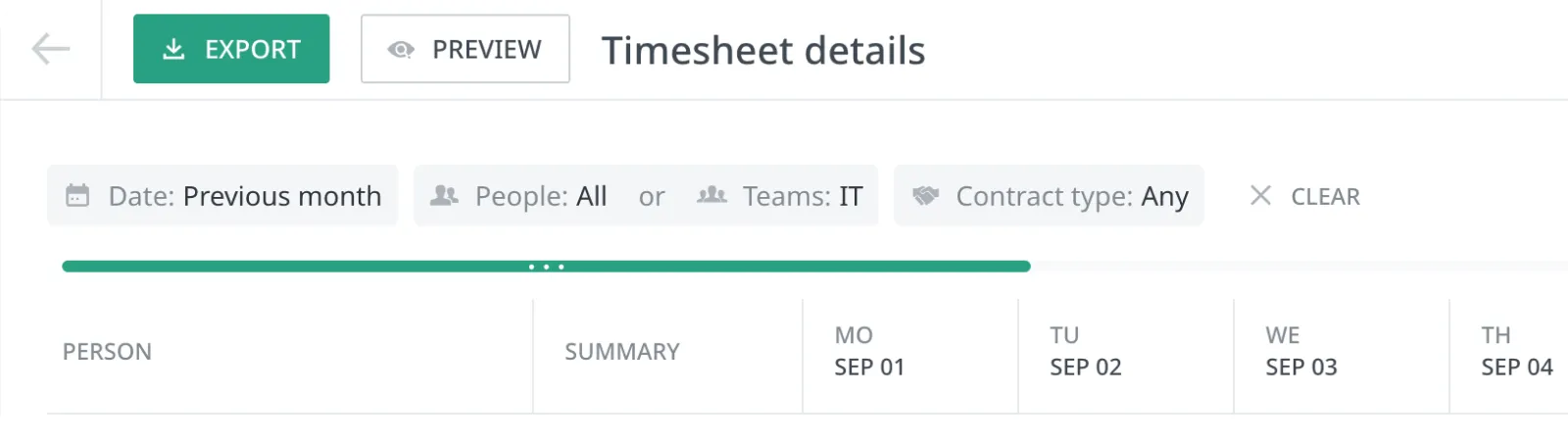 - Primary data: Planned work time, Working time, Worked vs planned, Holidays, Sum of all visible