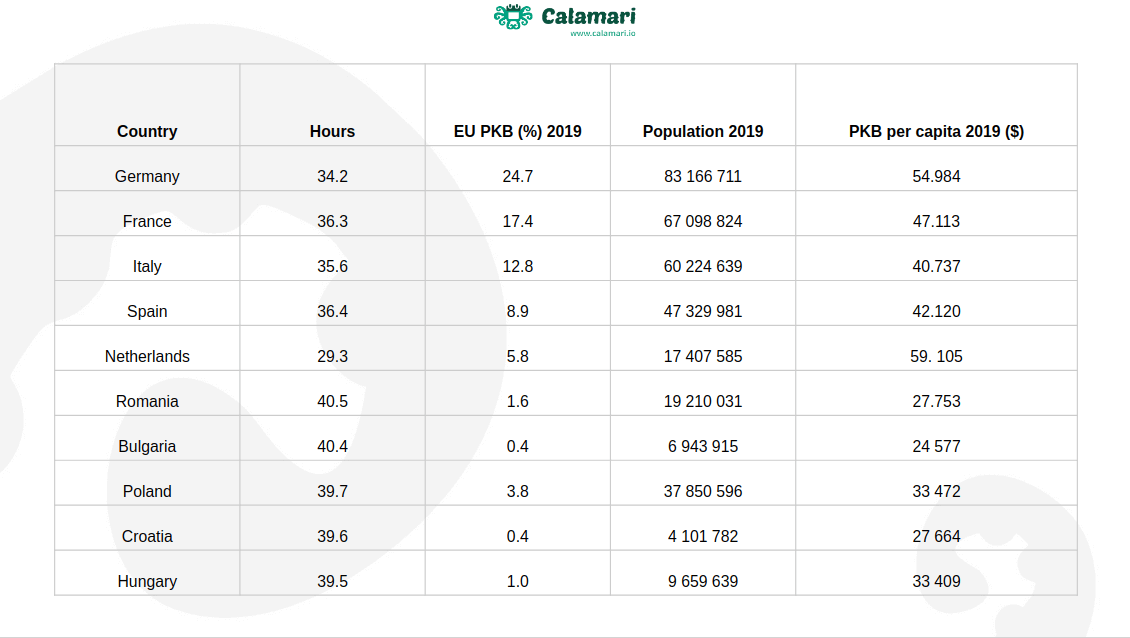 That is how much time employees work in different European countries. Based on the EU report about the contribution to the EU GDP it is easy to see a relationship between obligatory work hours and GDP contribution.