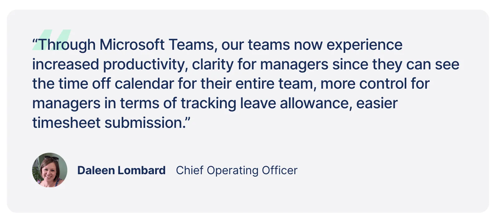 As Daleen Lombard from World’s Ultimate Travels confirms in their customer story: “Through Microsoft Teams, our teams now experience increased productivity, clarity for managers since they can see the time off calendar for their entire team, more control for managers in terms of tracking leave allowance, easier timesheet submission.”