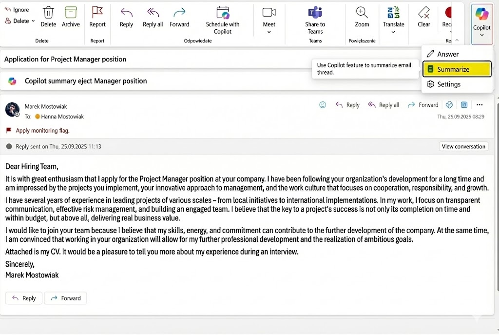 I clicked "Summarize" on a message with Marek's application for the Project Manager position. Below you see the entire message: