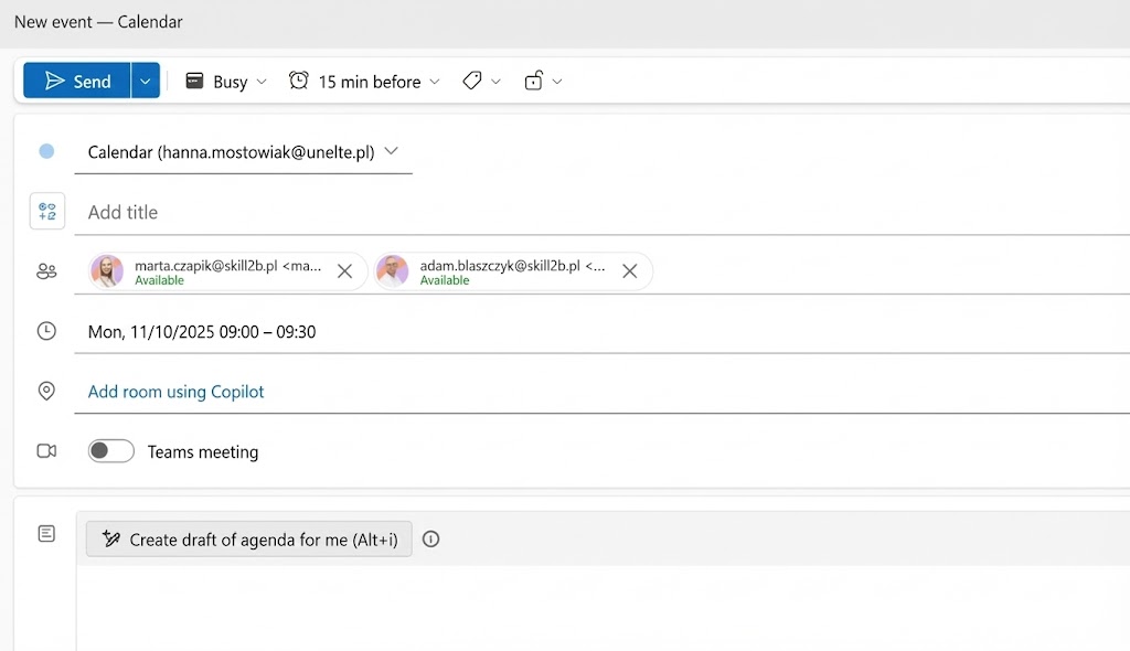 Additionally, Copilot can take into account specific criteria, e.g., meeting length or preferred days of the week, and also automatically send invitations after selecting the appropriate date. Thanks to this, the process of scheduling meetings becomes fast, hassle-free and minimizes the risk of conflicts in schedules.