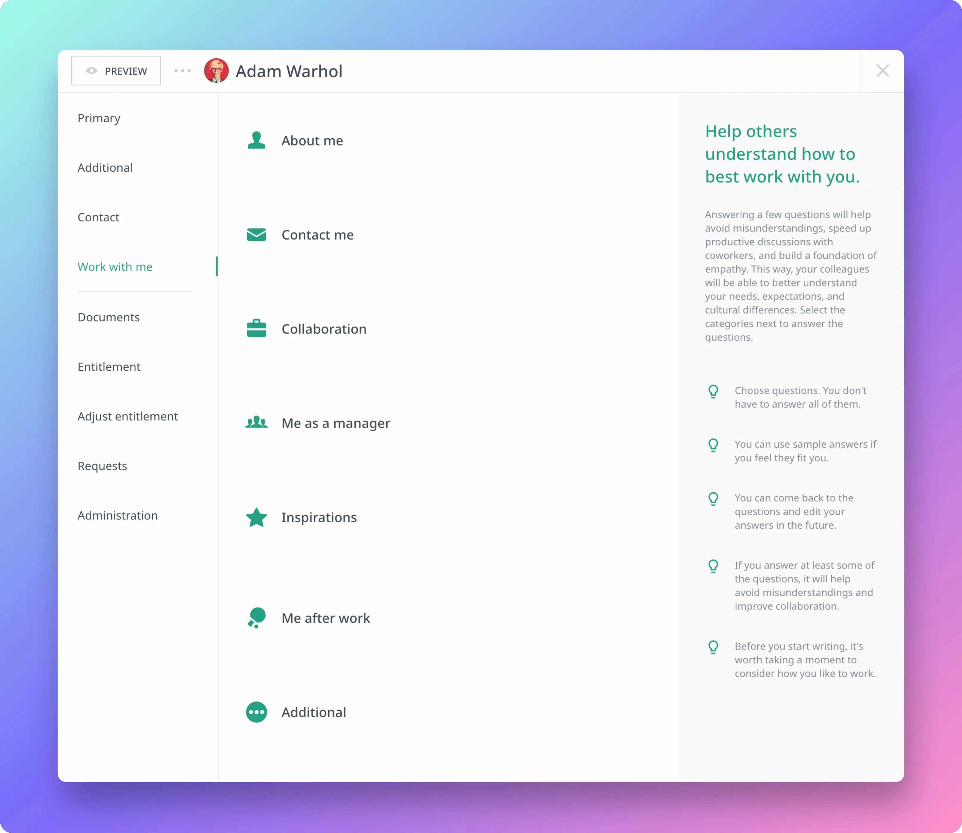 Before introducing the Work with Me to everyone in your company, you should start by talking to your C-level employees to fill out their manual first to encourage other employees to do it after it’s announced. This way, people will feel more comfortable sharing information about themselves. It’s also good to prepare some example answers for employees to use – it’s a simple way to help them think of what they would like to tell about themselves.