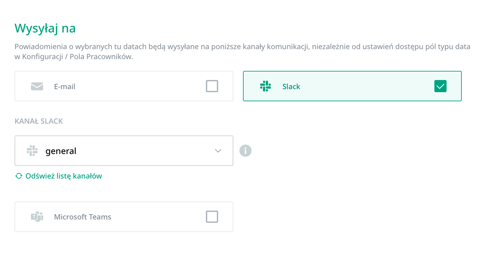 Create reminders based on any date field in the Employee module, including Custom Fields. Set a date range, choose a department or the whole company, and decide when and where the notification should go—to email, Slack, or Microsoft Teams.