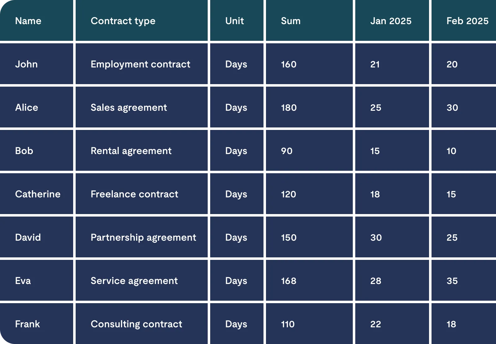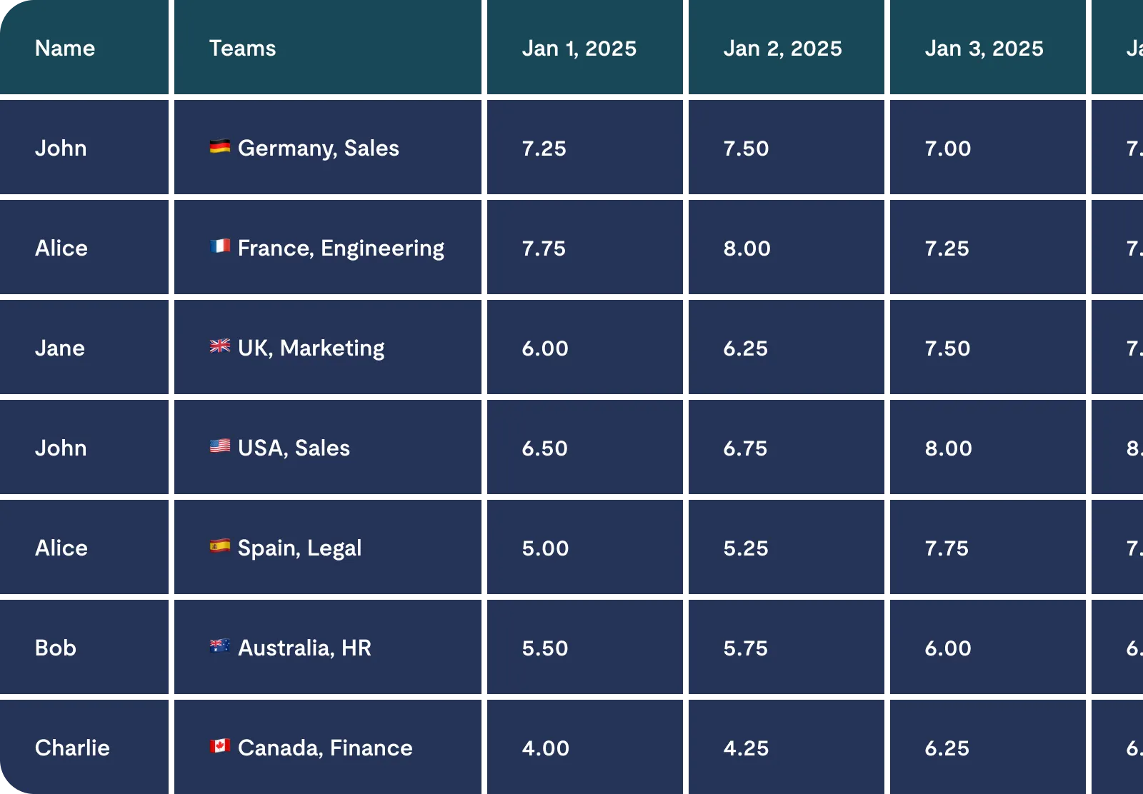 - Multi-location reporting for international teams—filter by country, contract type, or department instantly