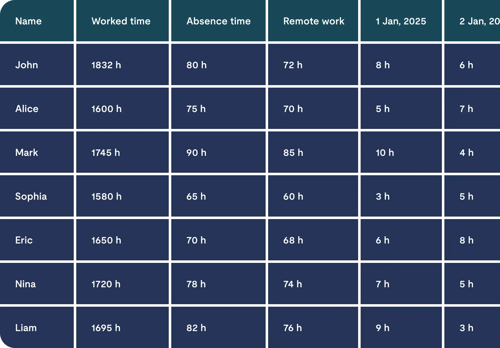 A consolidated view combining work time, leave requests, and projects. It allows for full column customization and filtering to see exactly what you need