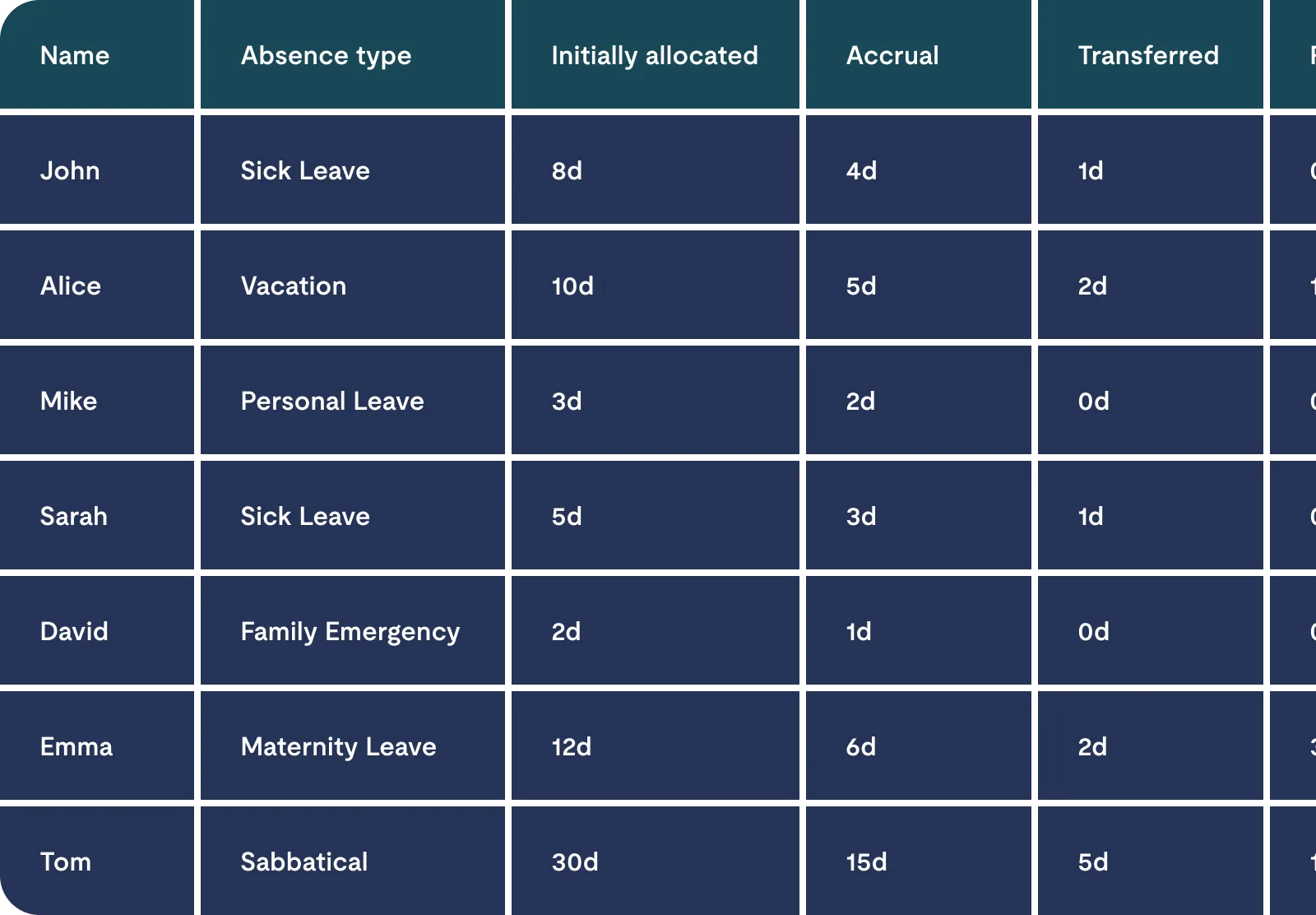 Reports on available, used, and carry-over leave days. Essential for year-end closing and budget reserves