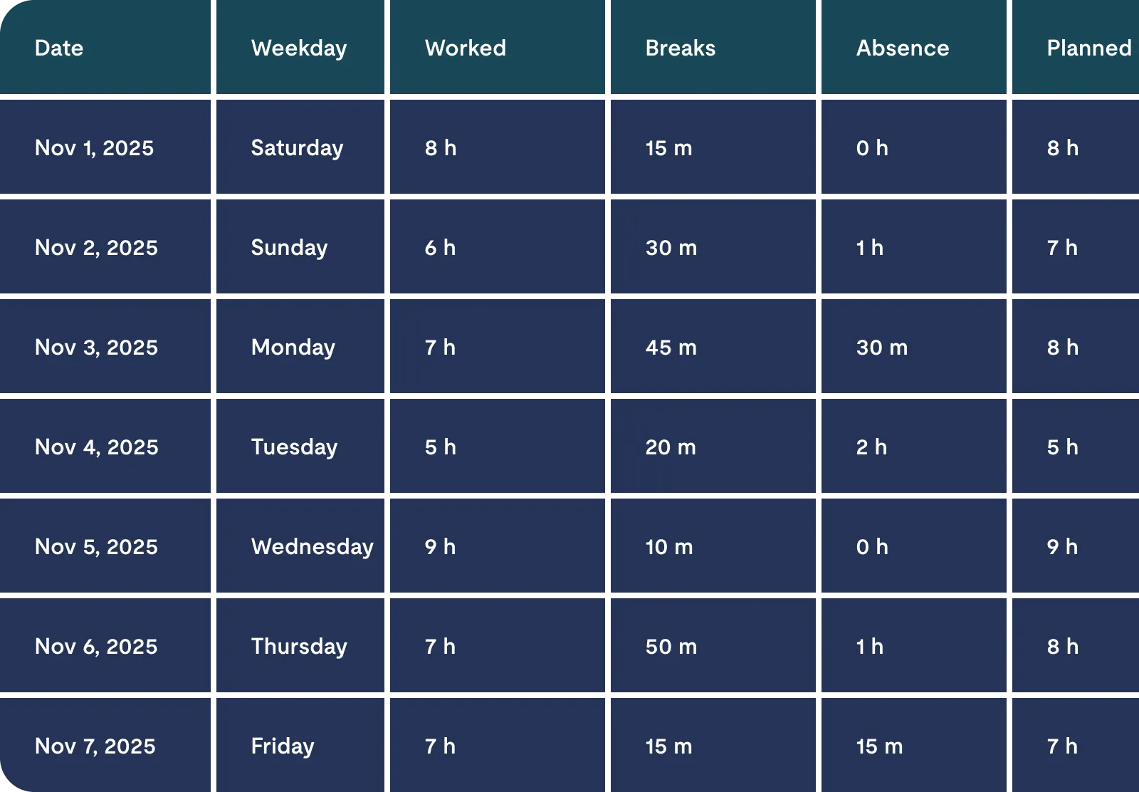 Provides a complete overview of work hours, breaks, and overtime within your chosen pay period (e.g. weekly or monthly)