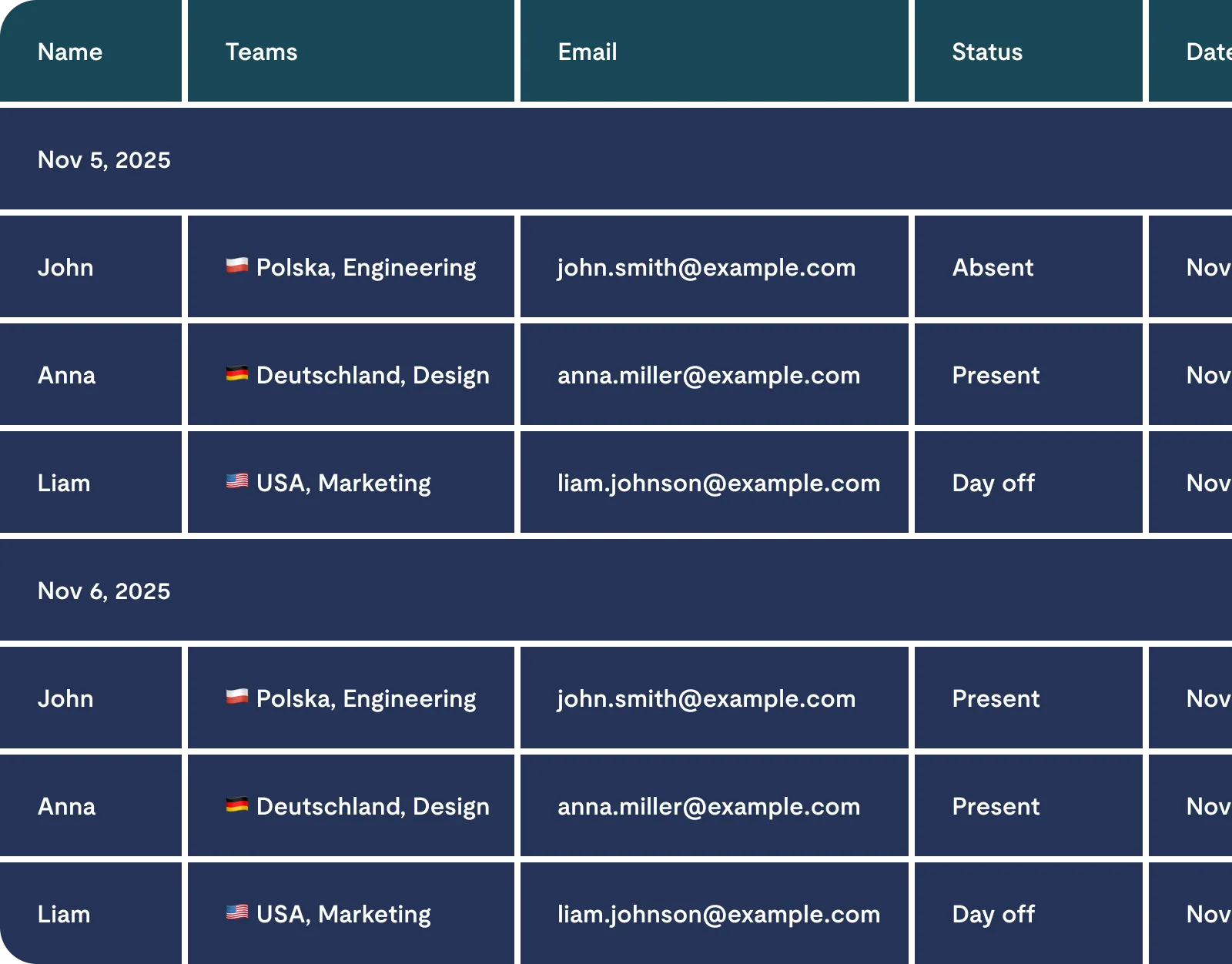 - One-click export to payroll systems (Enova365, Symfonia, Optima, R2Płatnik)