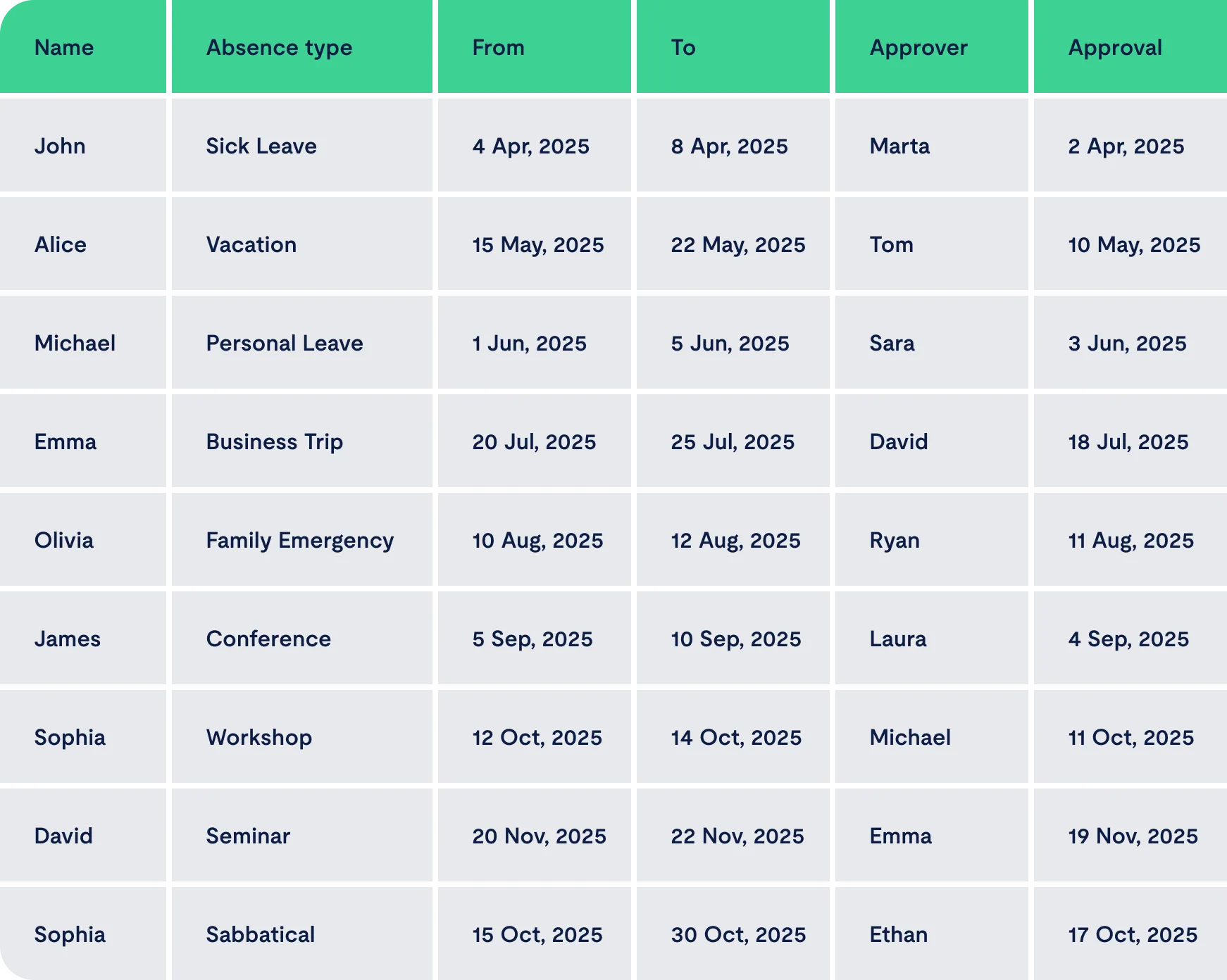 Focuses strictly on approved absences within a selected period, showing days or hours to be deducted